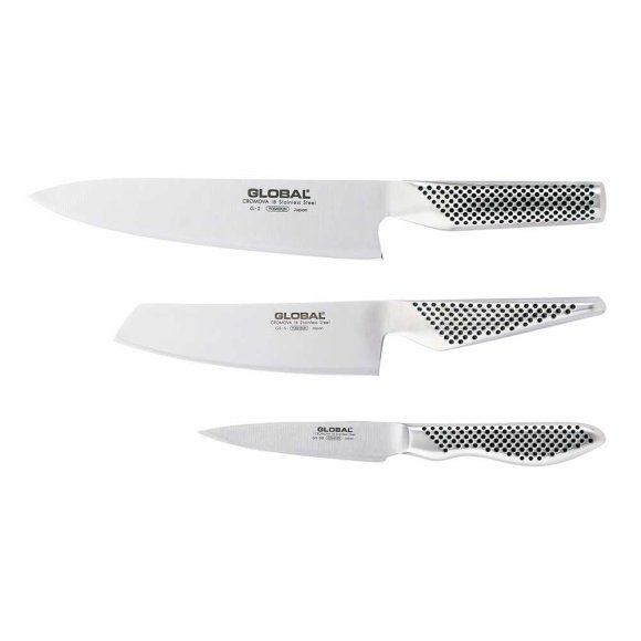 Global G‑2538 er et klassisk knivsæt bestående af tre essentielle køkkenknive, designet med Globals karakteristiske præcision og kvalitet. Sættet indeholder: