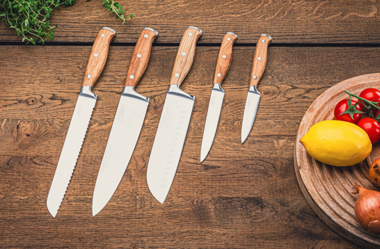 Santo, hvor hvert snit er en symfoni af præcision og elegance. Introducerer vores 5 dele knivsæt, meden kokke-, brød-, santoku-, universal- og urtekniv medalsidighed, der matcher ethvert køkkenbehov.