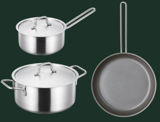 Pakken består af en stor gryde med låg, en kasserolle med låg samt en stegepande.