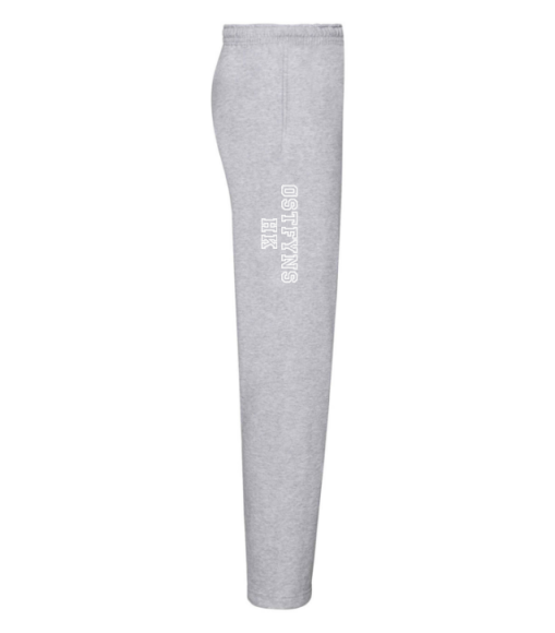 Elastisk linning med snoretræk, sidelommer og åben forneden ved benene med Østfyns HK trykt på det ene ben.